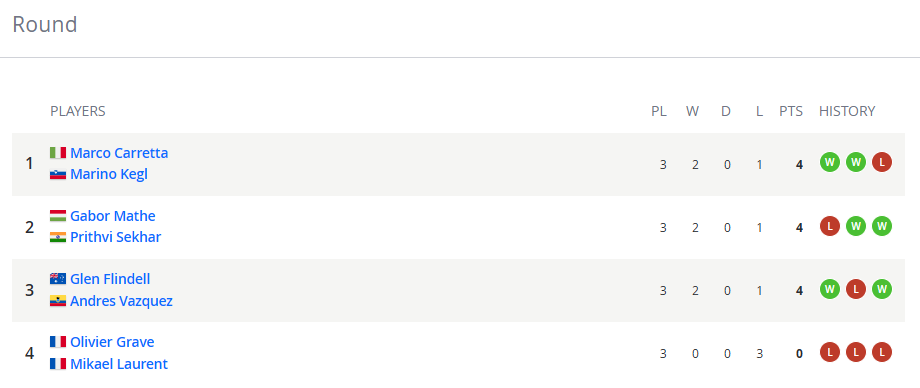 - A.Vázquez/G. Flindell vs M. Carretta/M.Kegl (4-6/6-3/11-9).