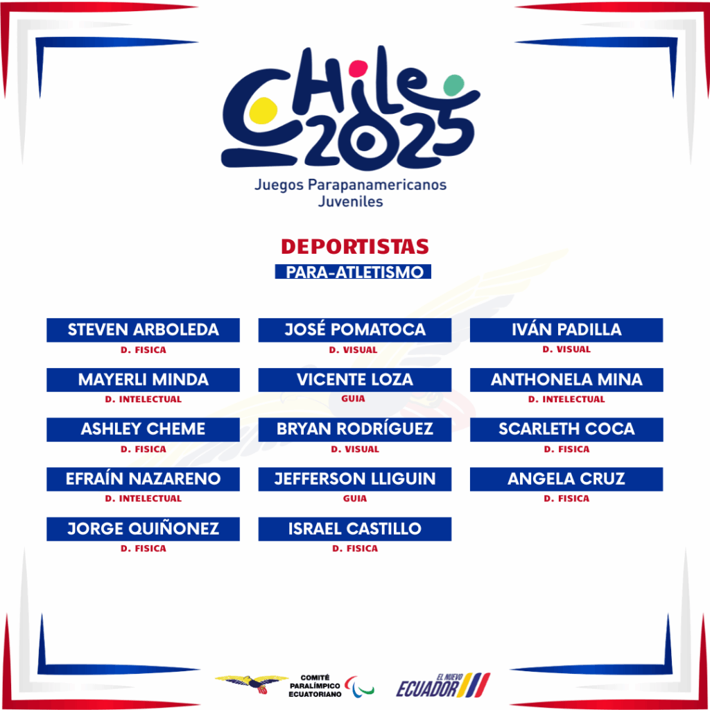 Con orgullo y compromiso, Ecuador se prepara para participar en los VI Juegos Parapanamericanos Juveniles Chile 2025, que se desarrollarán del 31 de octubre al 9 de noviembre, reuniendo a las nuevas generaciones de atletas con discapacidad de todo el continente.